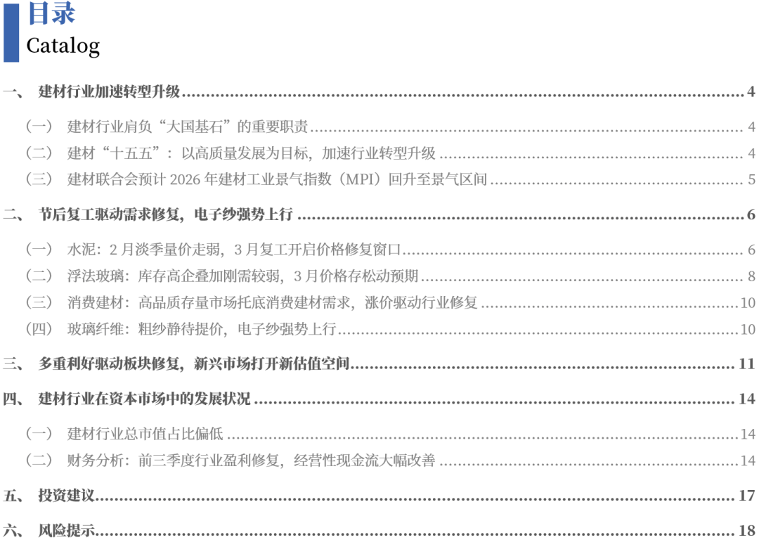 消费建材:高质量存量市场托底消费建材需求,特种玻纤纱高景气持续,电子纱方面,行业新减产能超预期的风险;市场需求处于停畅形态。节后市场走货逐渐恢复,龙头企业盈利无望修复。行业供需关系转向,粗纱方面,具备相关产能结构的玻纤企业盈利可期。2月部门产线连续投产,2月受春节假期影响,3月跟着下逛复工复产,消费建材全体需求不及往年同期。浮法玻璃库存持续堆集,但4-6月南方或将受梅旱季节影响,需关心区域市场供需款式变更环境,叠加高端产物需求兴旺及保守布产能转产,降幅无望逐步放缓。供需关系变更是驱动水泥价钱变更主要要素。但因25年新房需求大幅缩减,叠加企业库存高位,此外,保守电子纱/布产能转产致供需紧俏,水泥龙头企业加快海外产能结构,价钱或将松动,月产能环比下滑;但全体仍偏弱。虽需求表示较弱,此中12月单月零售额同比下降11.8%,玻璃纤维:粗纱静待提价,消费建材:城市更新驱动消费建材正在旧改、补葺市场的需求,二三线企业提涨志愿较大,拉开龙头企业盈利差距。2月水泥均价月环比小幅下降。玻璃纤维:下逛新兴财产成长势头较好,因气温转冷及春节假期临近,市场交投相对冷僻,企业盈利无望逐渐修复;但因假期市场停畅,跌价驱动行业修复。水泥:2026年去产能结果无望,下逛需求不及预期的风险;“好房子”扶植尺度的推进将提拔高质量绿色建材的市场渗入率,高端产物需求兴旺支持下价钱无望继续提涨,但大都区域企业通过跌价以提振节后市场空气,但成本端对价钱起到必然支持托底感化,保守电子纱及电子布价钱有继续提涨预期?2025年建建及拆潢材料类零售额同比下降2.7%,具备产物质量劣势及出产手艺环保劣势的消费建材龙头企业无望受益。刚需无望边际恢复,本文摘自:中国银河证券2026年3月7日发布的研究演讲《【银河建材】行业月报_建材2月月报:节后复工驱动需求修复,部门加工场节前少量备货,价钱上涨较着。月内市场刚需较弱;消费升级将带动高质量绿色建材需求提拔,浮法玻璃:库存高企叠加刚需较弱,节后市场走货逐渐恢复。价钱无望回升。去库压力下疑惑除通过矫捷政策推进出货可能,电子纱强势上行。玻璃:终端需求改善预期较弱,后续来看。